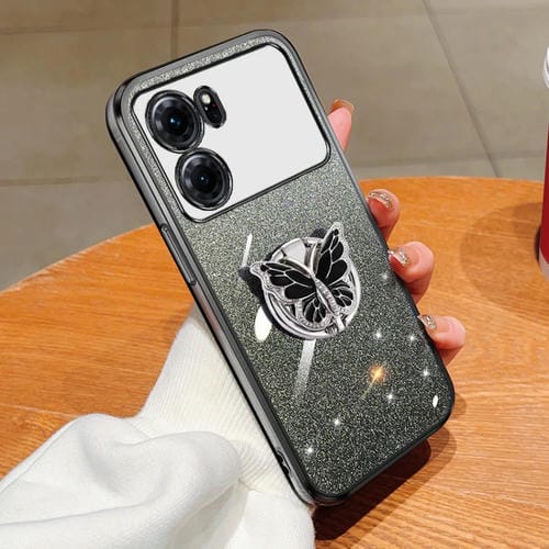 Para Oppo K10 Funda para Teléfono de TPU con Soporte de Mariposa con Brillo Degradado Plateado (Negro)