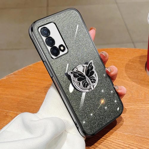 Para Oppo K9 Funda para Teléfono de TPU con Soporte de Mariposa con Brillo Degradado Plateado (Negro)