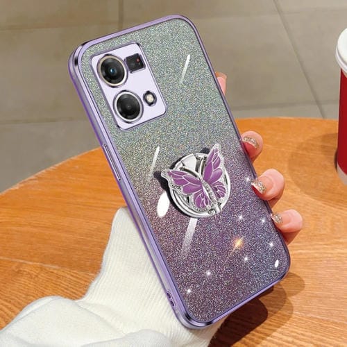 Para Oppo Reno7 4G Estuche para Teléfono de TPU con Soporte de Mariposa con Brillo Degradado Plateado (Púrpura)