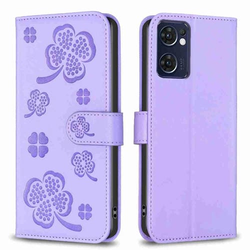 Para Oppo Reno7 5G / Find X5 Lite Funda para Teléfono de Cuero con Relieve de Cuatro Hojas (Púrpura)