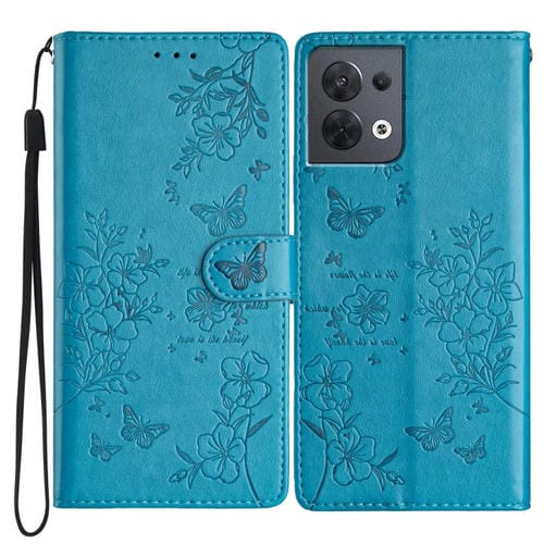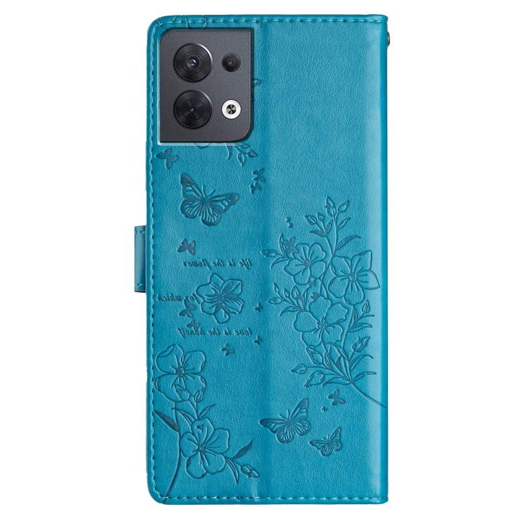 Para Oppo Reno8 5G Global Butterfly Love Flower Funda de Cuero para Teléfono En Relieve (Azul)