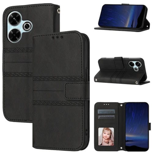 Para Redmi 13 4G Funda de Cuero con Sensación de Piel y Rayas En Relieve (Negro)