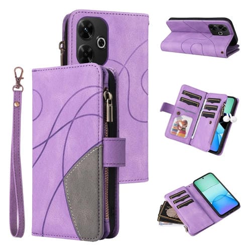 Para Redmi 13 4G Global Funda de Cuero para Teléfono con Billetera con Cremallera y 9 Ranuras para Tarjetas de Dos Colores (Púrpura)