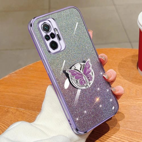 Para Redmi Note 10 Pro 4G Funda para Teléfono de TPU con Soporte de Mariposa con Brillo Degradado Plateado (Púrpura)