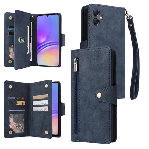 Funda de Cuero para Samsung Galaxy A05 con Remache Hebilla y 9 Tarjetas con Tres Pliegues (Azul)