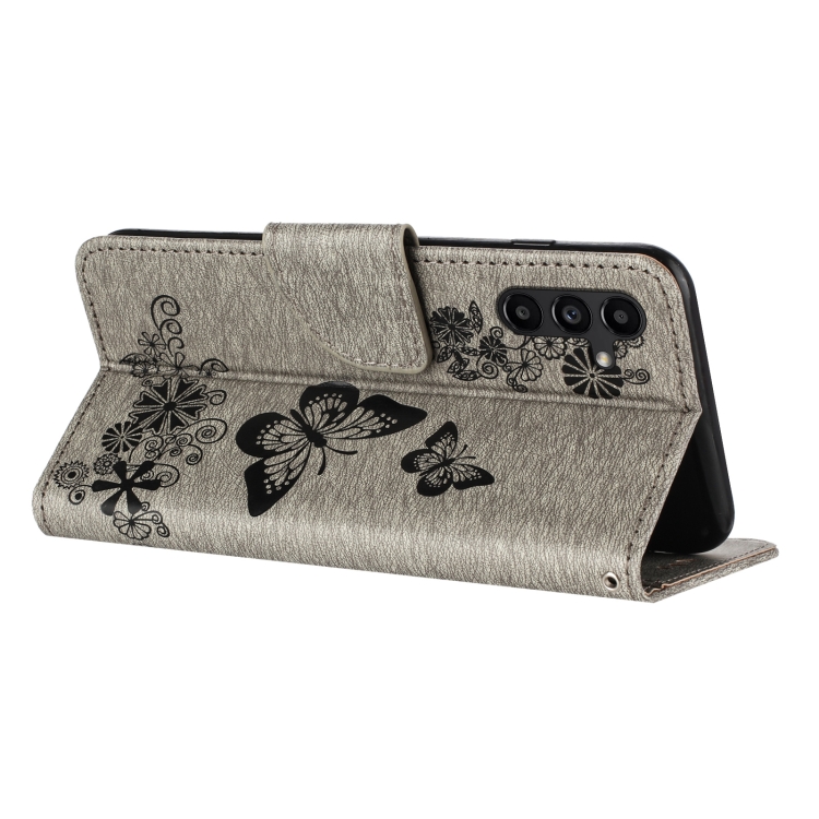 Funda de Cuero para Samsung Galaxy A15 con Tapa en Relieve Mariposa (Gris)