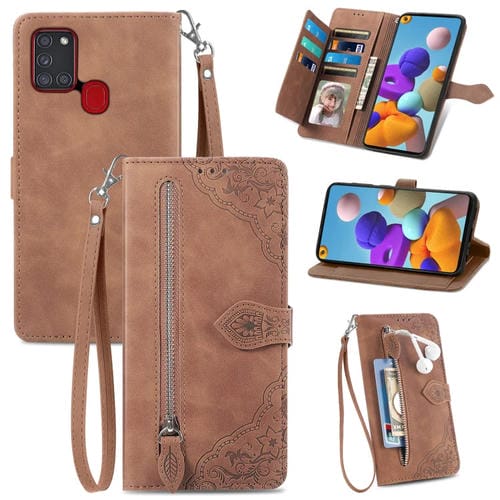 Funda de Cuero para Samsung Galaxy A24S con Cremallera y Flores en Relieve (Marrón)