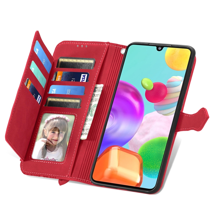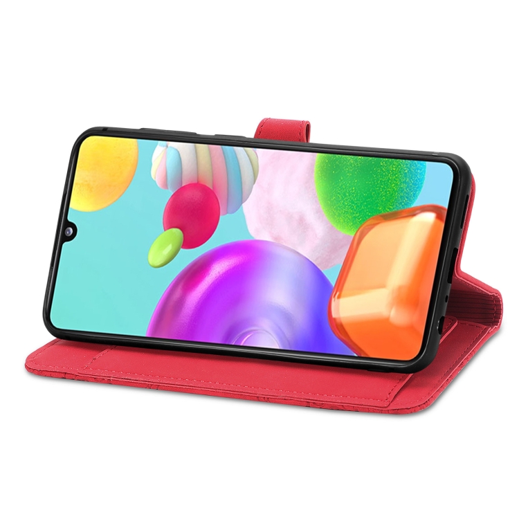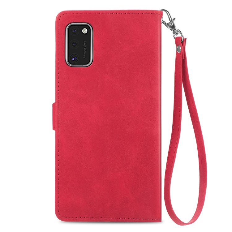 Funda para Samsung Galaxy A41 Cuero con Cremallera y Flores en Relieve (Rojo)