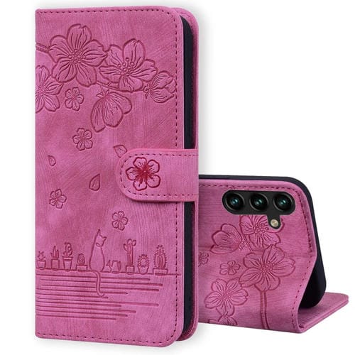 Funda para Teléfono Samsung Galaxy A55 5G Cuero Relieve Gato Sakura Dibujos Animados (Rojo Rosa)