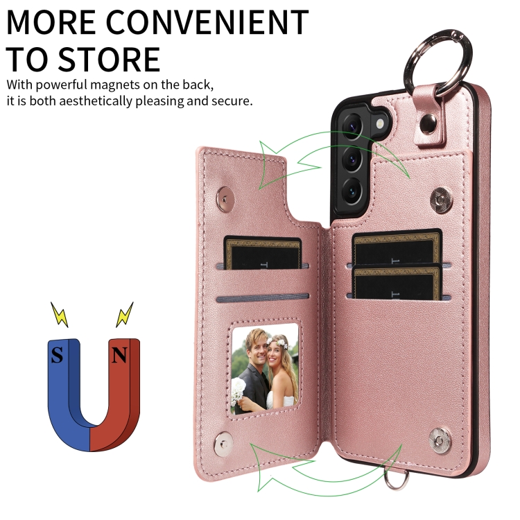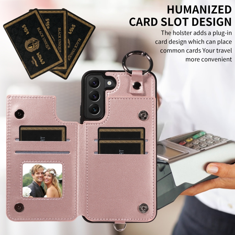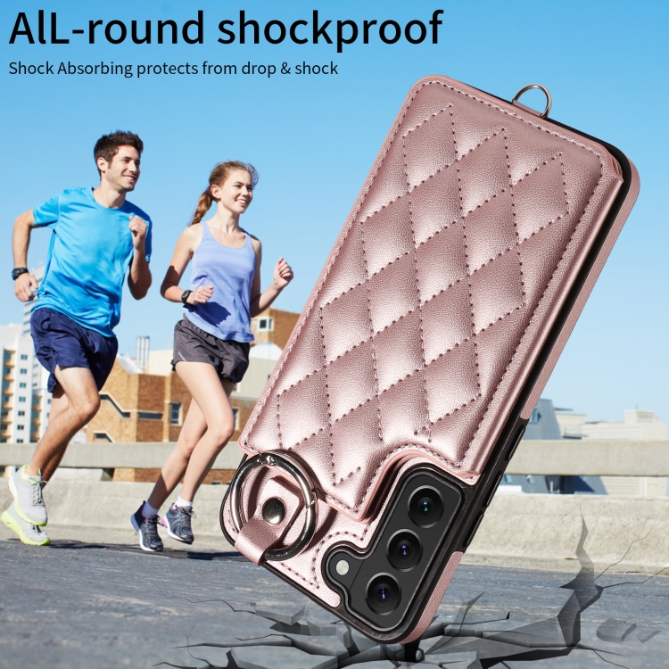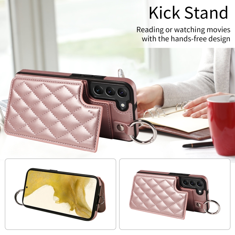 Estuche para teléfono Samsung Galaxy S22+ 5G con bolsa para tarjetas textura rómbica y cordón corto (Oro Rosa)