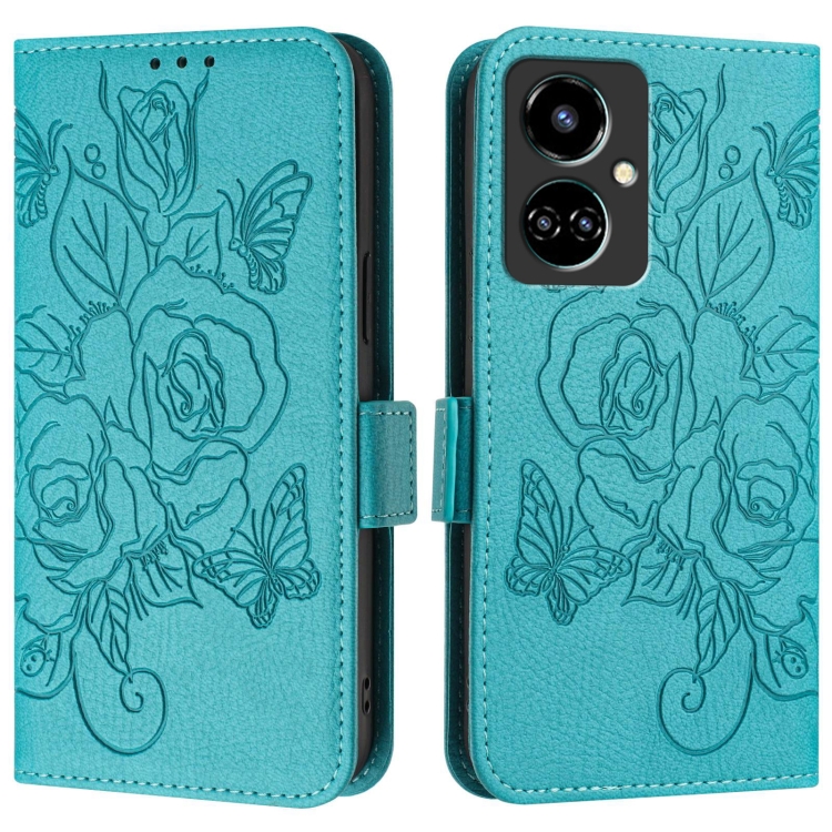 Funda de Cuero Antirrobo RFID para Tecno Camon 19 con Rosa en Relieve (Azul Claro)