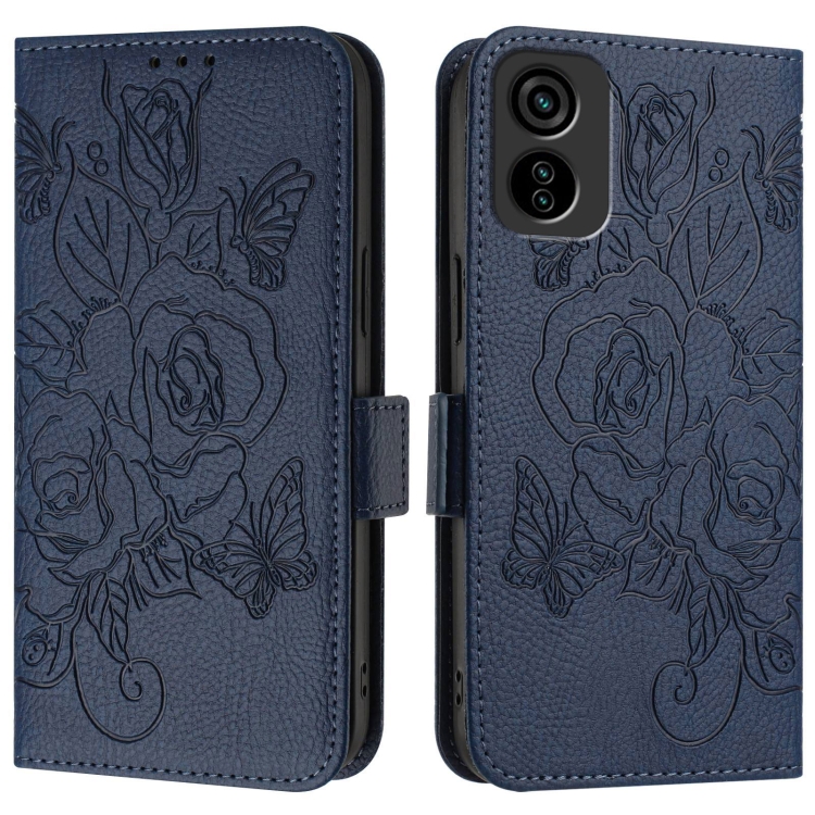 Estuche para Teléfono Tecno Pop 6C Cuero Antirrobo RFID con Rosa en Relieve (Azul Oscuro)