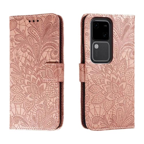 Para Vivo S18 Funda de Cuero con Tapa y Estampado de Flores de Encaje (Oro Rosa)