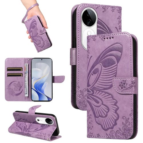 Para Vivo V40 5G Swallowtail Butterfly Funda de Cuero para Teléfono En Relieve (Púrpura)