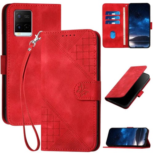 Para Vivo Y33S 4G Global Yx0080 Grid Butterfly Patrón En Relieve Funda de Cuero con Tapa para Teléfono con Cordón (Rojo)