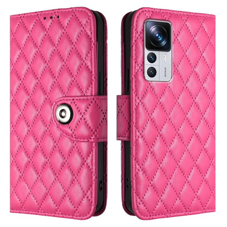 Para Xiaomi 12T / 12T Pro Funda de Cuero con Tapa con Textura Rómbica y Cordón (Rojo Rosa)