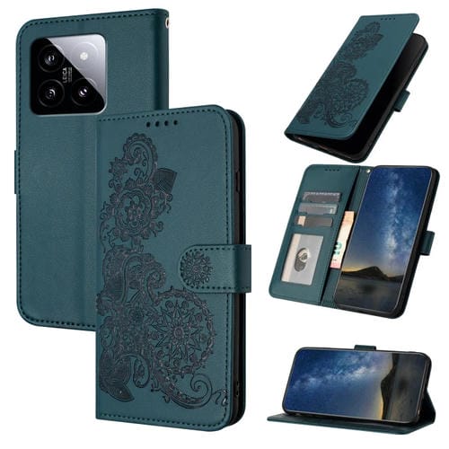 Para Xiaomi 14 Datura Flower Funda De Cuero Con Tapa En Relieve (Verde Oscuro)