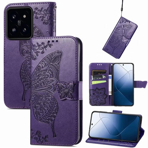 Para Xiaomi 14 Pro Butterfly Love Flower Funda De Cuero Para Teléfono En Relieve (Púrpura Oscuro)