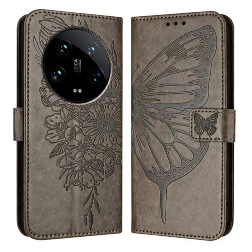 Para Xiaomi 14 Ultra 5G Funda Para Teléfono De Cuero Con Mariposa En Relieve Global (Gris)