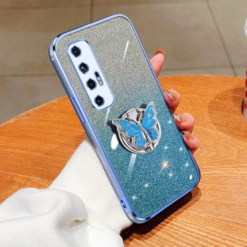 Para Xiaomi Mi 10S Funda para Teléfono de TPU con Soporte de Mariposa con Brillo Degradado Plateado (Azul Sierra)
