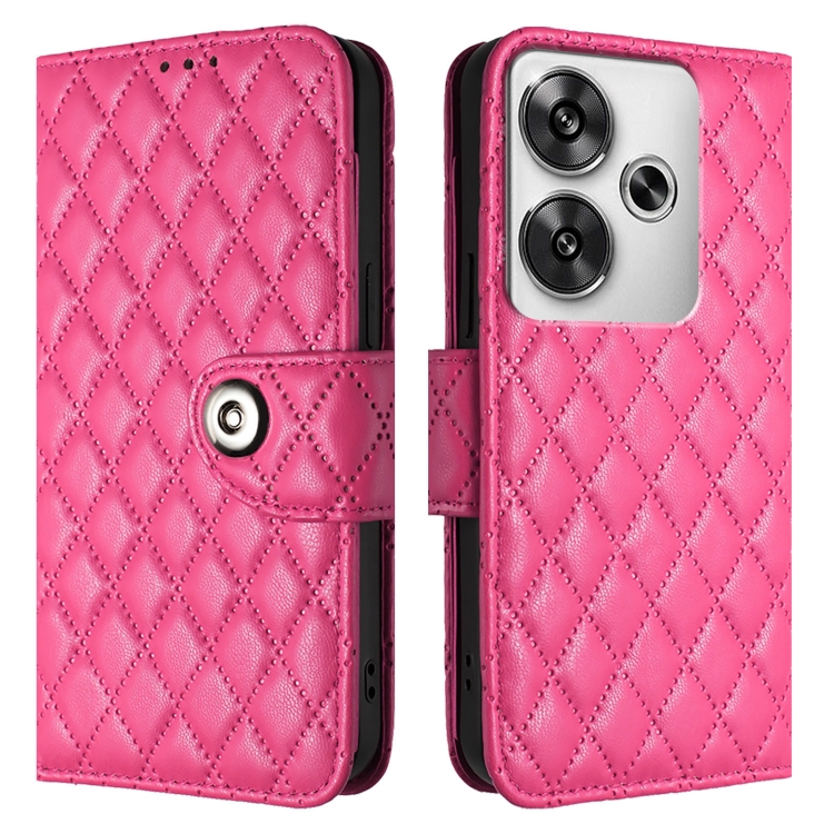 Para Xiaomi Poco F6 5G Funda para Teléfono con Tapa de Cuero con Textura Romboidal y Cordón (Rojo Rosa)