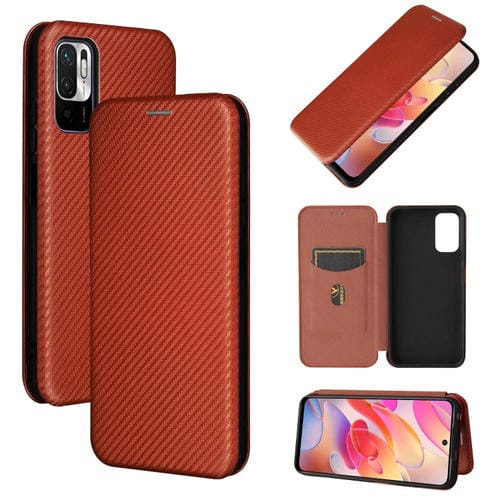 Para Xiaomi Poco M3 Pro 5G / 4G Fibra de Carbono Textura Magnética Horizontal Flip TPU + PC + Funda de Cuero Pu con Ranura para Tarjeta (Marrón)