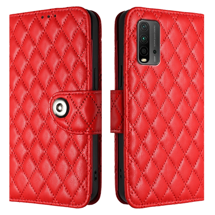 Para Xiaomi Poco M3 / Redmi 9T Funda de Cuero con Tapa con Textura Romboidal y Cordón (Rojo)