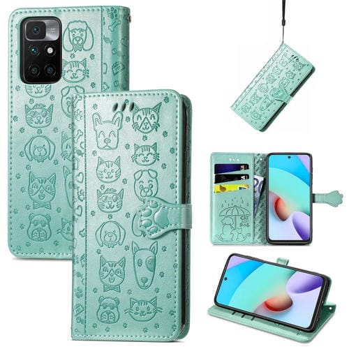 Para Xiaomi Redmi 10 Encantador Patrón de Gato y Perros con Estampado de Estampado Horizontal Flip de Cuero, con Soporte y Tragamonedas y Billetera y Billetera y Cordón de Dibujos Animados (Verde)