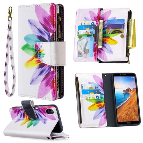 Para Xiaomi Redmi 7A Patrón de Dibujo de Colores Cremallera Funda de Cuero con Tapa Horizontal con Soporte y Ranuras para Tarjetas y Billetera (Sun Flower)