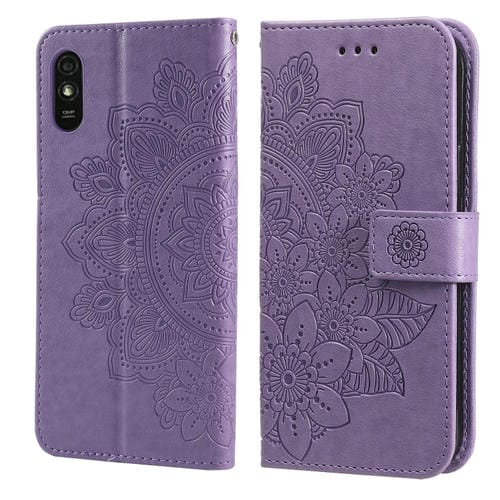 Para Xiaomi Redmi 9A 7-Petal Flores Patrón de Estampado En Relieve Funda de Cuero de la Pu de la Pu con El Soporte y Las Ranuras para Las Tarjetas y El Marco de la Billetera y la Foto (Púrpura Claro)