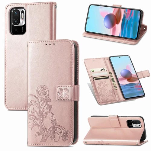 Para Xiaomi Redmi Note 10 5G Cierre de Cuatro Hojas con Hebilla En Relieve Protección de Teléfono Móvil Funda de Cuero con Cortante y Ranura para la Tarjeta y la Función de la Billetera y El Soporte (Oro Rosa)
