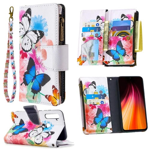 Para Xiaomi Redmi Note 8T Patrón de Dibujo de Colores Cremallera Funda de Cuero con Tapa Horizontal con Soporte, Ranuras para Tarjetas y Billetera (Dos Mariposas)