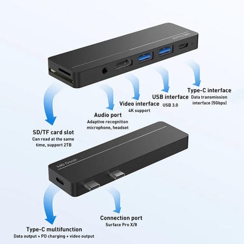 • Interfaz de salida: HDMI 4K (3840x2160) a 30Hz, LAN, ranura para Tarjeta SD/TF (lectura simultánea hasta 2TB), USB 3.0 con tasa de transferencia de 5 Gbps, Puerto Type-C para Carga PD60W/100W y transmisión de datos a 10 Gbps, Puerto de audio de 3,5 mm