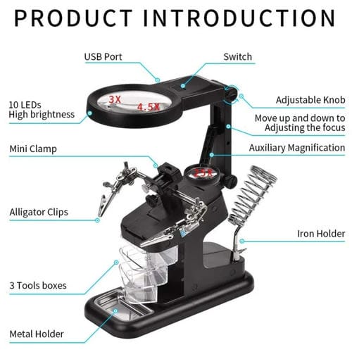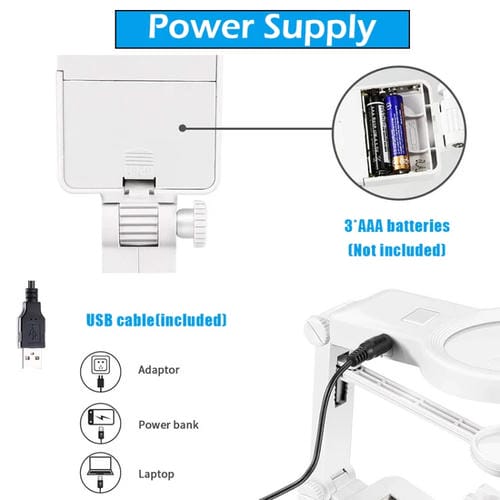El Escritorio Lupa de Inspección para Reparación de Soldaduras de Chips Multifuncional con Luz LED (Blanco) es una herramienta especializada diseñada para facilitar la revisión y reparación precisa de componentes electrónicos pequeños, especialmente soldaduras de chips. Este dispositivo cuenta con un sistema de aumento múltiple (3x, 25x y 45x) mediante Lentes ópticas acrílicas, proporcionando una visualización detallada para usuarios que reparan por cuenta propia o técnicos especializados. Su diseño incluye una Base estable y una capacitación auxiliar giratoria de 360 grados con ángulo ajustable, permitiendo una manipulación cómoda y adaptada a distintas necesidades. La iluminación se consigue mediante 10 luces LED integradas, que aseguran una visibilidad óptima durante el trabajo. Compatible con fuentes de Alimentación a través de 3 Baterías AA o Conexión USB, este escritorio lupa es adecuado para tareas de microscopía ligera y reparación electrónica en entornos profesionales o de taller.