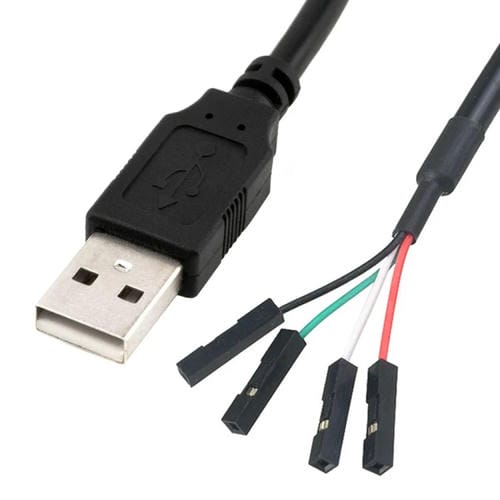• Conector de 4 pines Dupont con identificación por colores (Rojo 5V+, Blanco datos asincrónicos envío, Verde datos asincrónicos recepción, Negro tierra); longitud de 0,3 metros; Carcasa de PVC Flexible y resistente