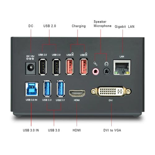 • Soporta triple salida de video (HDMI, DVI, VGA) con resolución máxima de 2048 × 1152 px; Puerto Gigabit Ethernet; Puertos USB 3.0/2.0; Carga rápida mediante Puerto CC; chipset DL-3900, VL813, EJ179V; requiere procesador Core i3 o superior y 4GB de memoria mínima para óptimo rendimiento